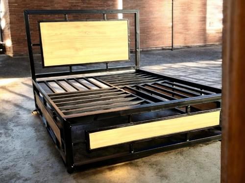 The bed features a minimalist, industrial look with a tubular steel frame and wood-effect inserts in the headboard and footboard.